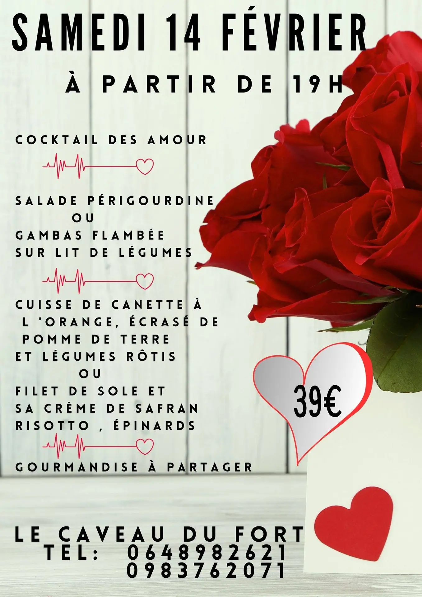 Le Caveau du Fort vous invite à partager un menu spécial Saint-Valentin, imaginé pour éveiller les sens et créer de beaux souvenirs !