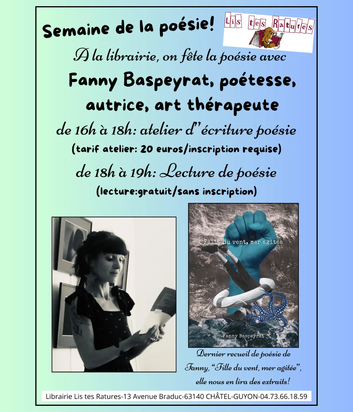 Fanny Baspeyrat, poétesse, autrice et art-thérapeute, animera un atelier d'écriture de 16h à 18h, puis elle nous lira des extraits choisis de son dernier recueil de poèmes "Fille du vent, mer agitée",de 18h à 19h.