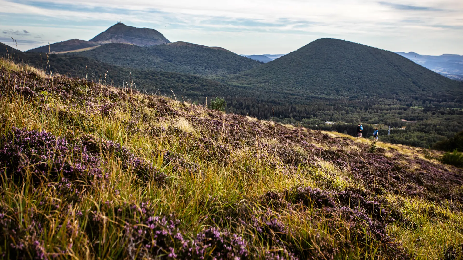 4/ Take the path on the left, following the crater rim to the summit (view of the puy de Dôme, the Puys chain, the Sancy massif, the Artense, the Combrailles and, overhanging, the puy de Lemptégy quarry and the Vulcania site). Follow a fence along the edge of the wood and then descend into the beech forest. At the bottom of the descent, cross a fence using a stepladder.