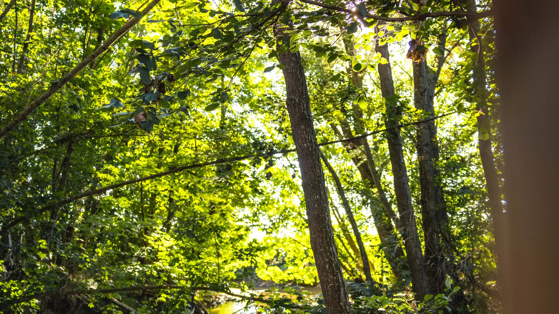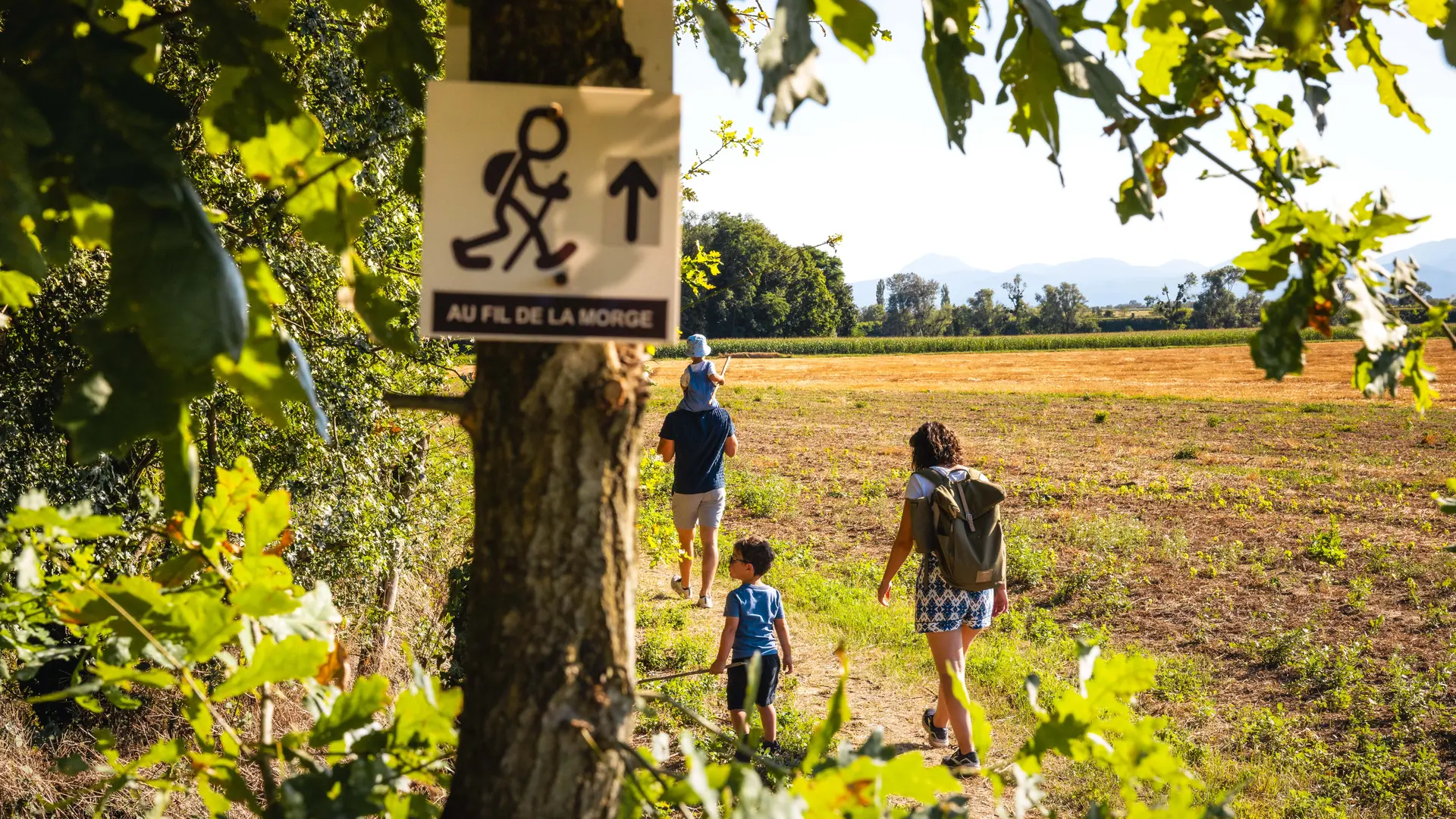 3/ Prendre à gauche et passer sous le pont SNCF. Continuer jusqu’à l’église de La Moutade et prendre à droite entre la dernière maison du bourg et le pont de la Morge. Laisser 2 chemins à droite, puis prendre le sentier sur la gauche dans le bosquet à l’entrée du champ.