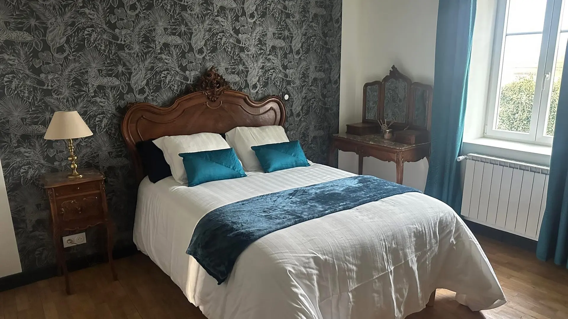 La chambre style vintage pouvant accueillir jusqu’à 4 personnes composée de deux lits doubles avec sa grande salle de bain attenante avec douche, baignoire, doubles vasques, wc