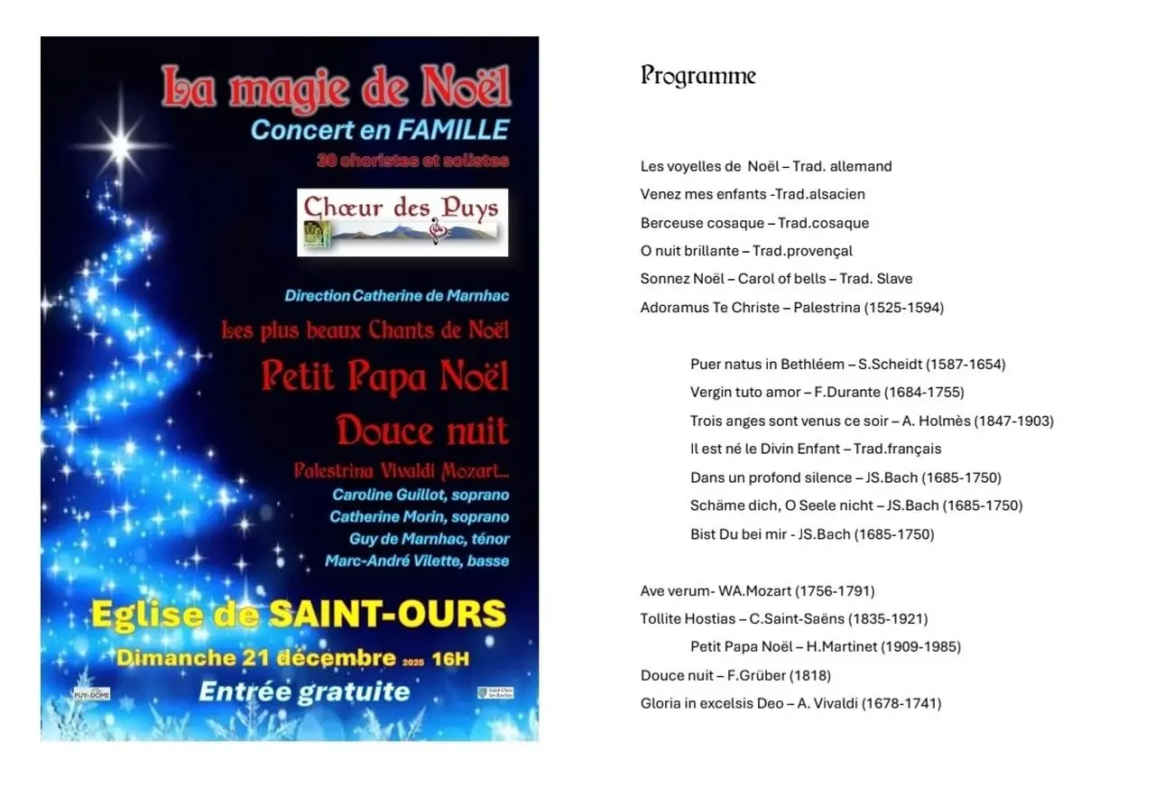 le « Chœur des Puys » : polyphonique, classique et lyrique, dirigé par Catherine de Marnhac a le plaisir de partager les magnifiques chants de Noël.
