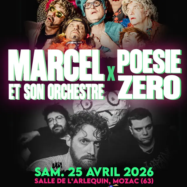 L'équipe de La Puce a L'Oreille et la ville de Mozac ont le plaisir de vous présenter à la salle de l'Arlequin à Mozac, dans le cadre du festival Arts en Territoire : Marcel et son Orchestre + Poesie Zero