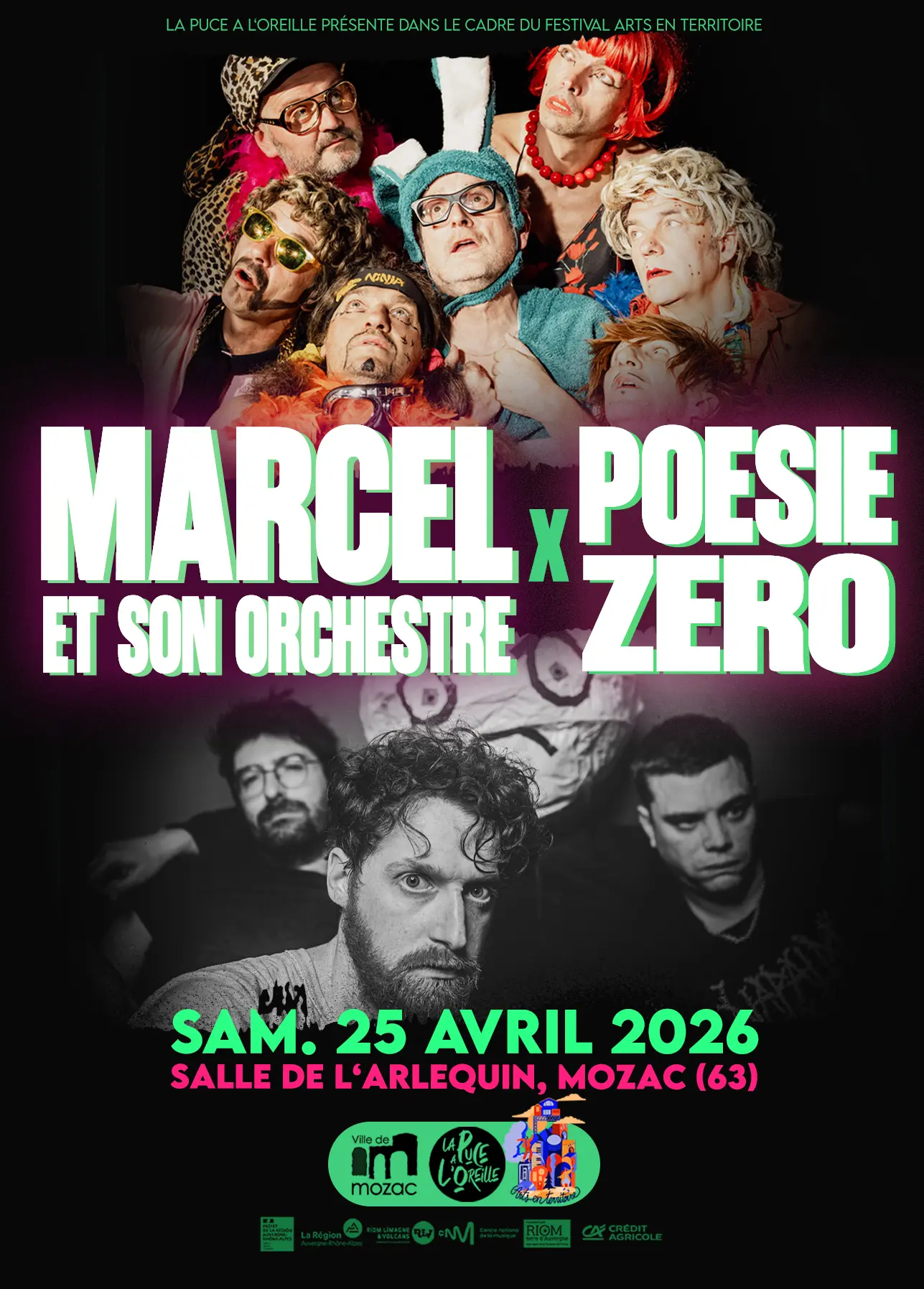 L'équipe de La Puce a L'Oreille et la ville de Mozac ont le plaisir de vous présenter à la salle de l'Arlequin à Mozac, dans le cadre du festival Arts en Territoire : Marcel et son Orchestre + Poesie Zero