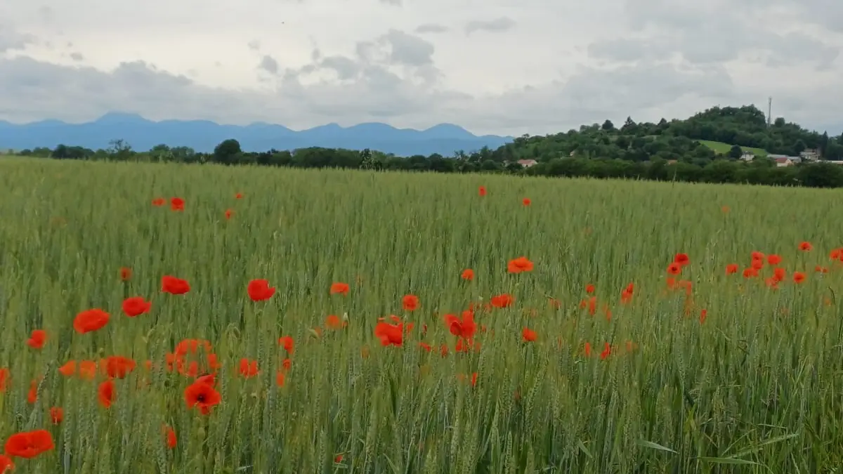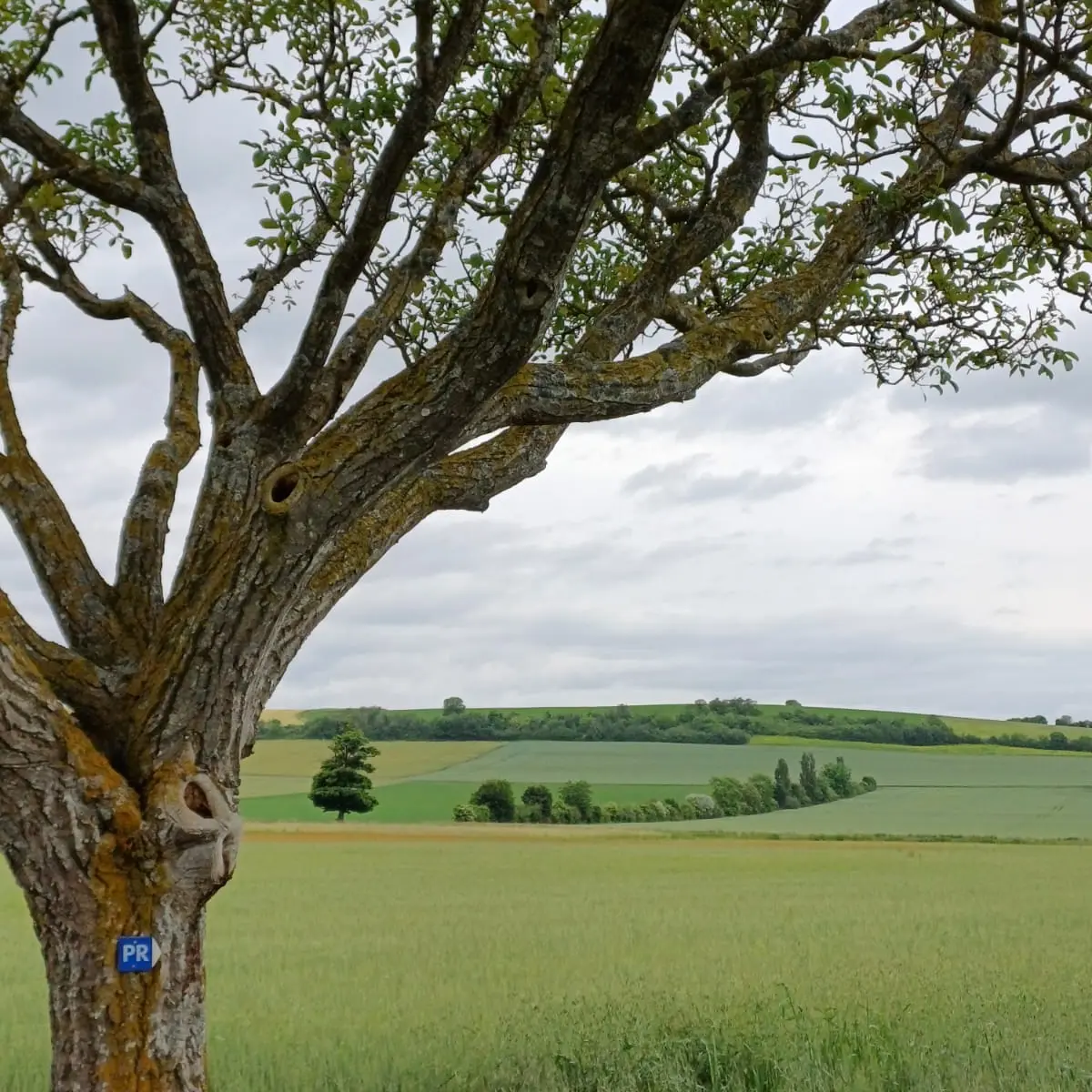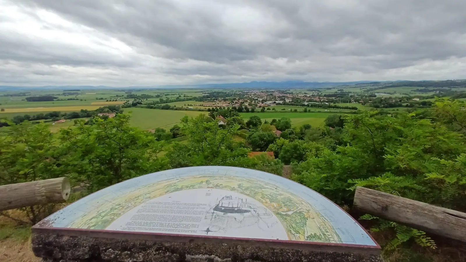 3/ S’engager à gauche sur une sente pentue pour accéder à une esplanade. Aller à gauche, longer le château d’eau puis monter à droite un large sentier herbeux menant aux 2 tables d’orientation situées au sommet, côtés Sud et Nord (PV1 : 2 panoramas à 180°). Redescendre par le même chemin et, au niveau du château d’eau, descendre la route à droite. Au carrefour, poursuivre à droite. Après la Place de La Forge, traverser une route et continuer en face sur le Chemin du Pré Perlin jusqu’à une première intersection.