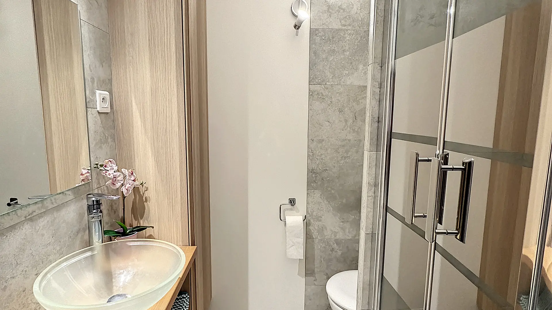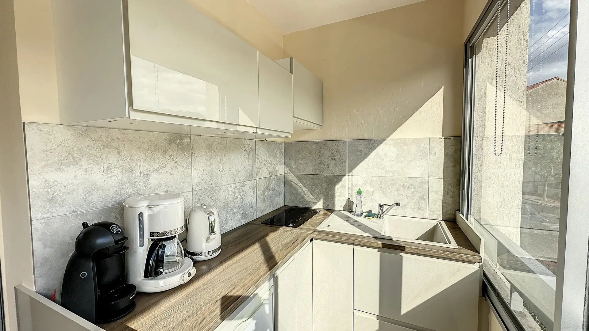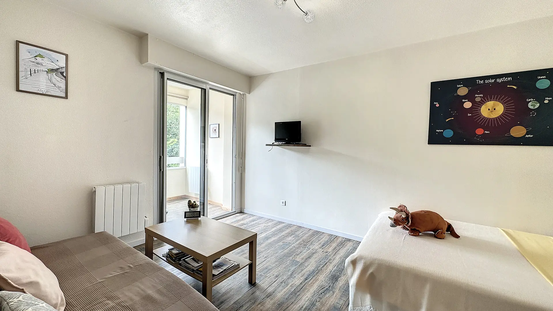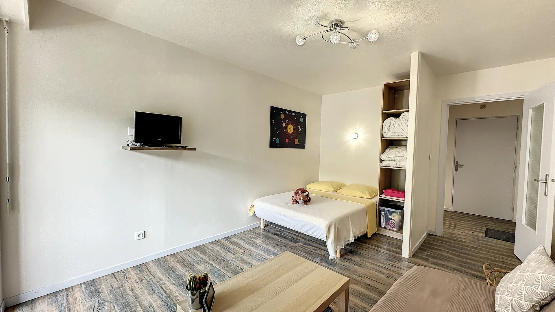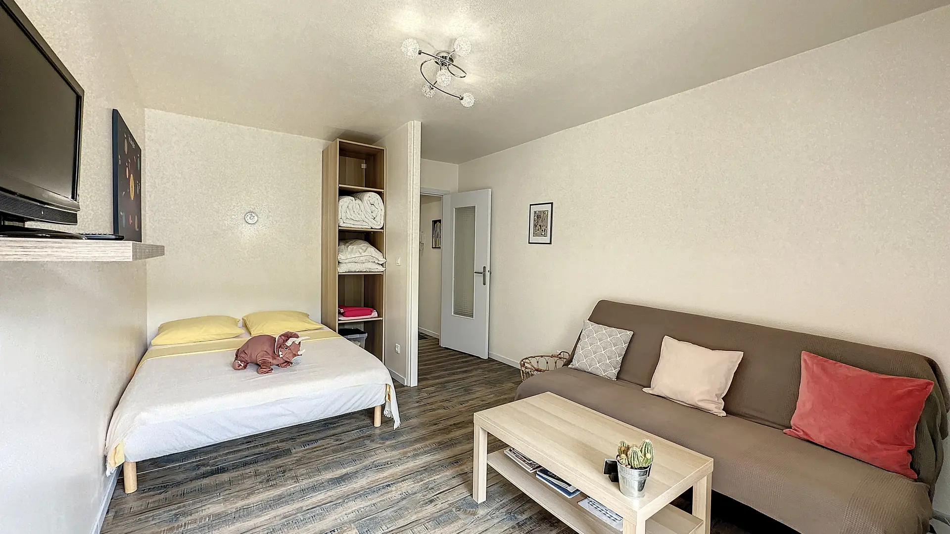 Studio disposant d'une entrée avec penderie, un séjour avec un lit (140x190), un canapé convertible (130x190), une télévision, Wifi, une cuisine indépendante équipée et aménagée (réfrigérateur, micro-ondes, plaque vitro-céramique, cafetière, bouilloire), et une salle d'eau avec douche & WC.