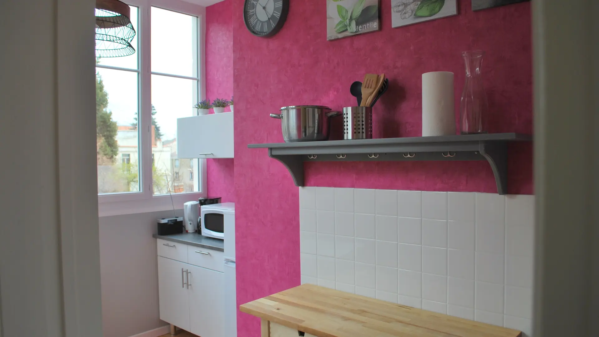 Il se compose d'une cuisine indépendante avec deux baies vitrées (réfrigérateur - congélateur, mini- four, micro-onde, plaque vitrocéramique), table et chaise, lave linge séchant. Une chambre avec lit double fait à l'arrivée si location de draps (140x190) et d'une salle d'eau, télévision et wifi.