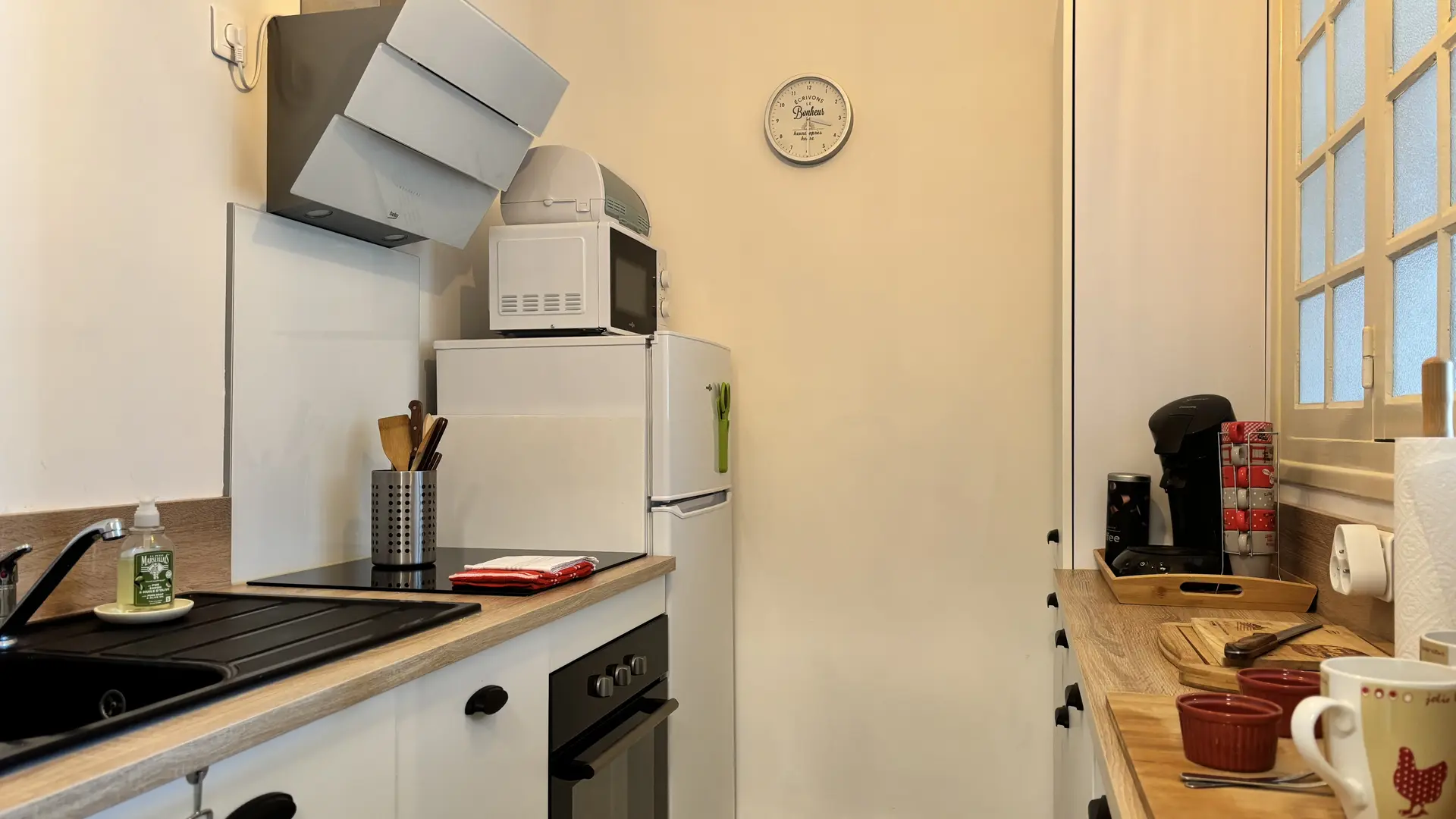 La cuisine est neuve proposant une plaque à induction, un four, un frigo / congélateur, une machine à laver de marque afin que vous vous sentiez comme dans votre 2e maison.