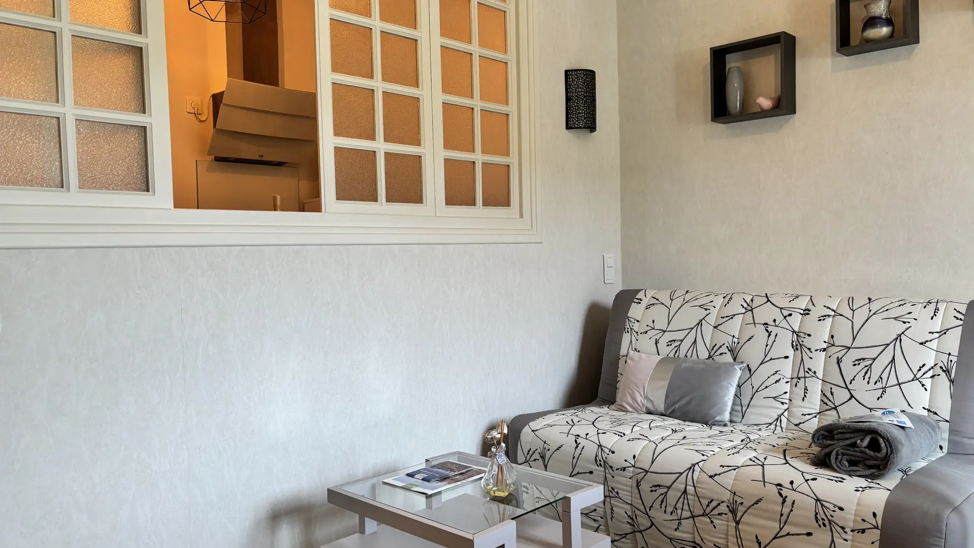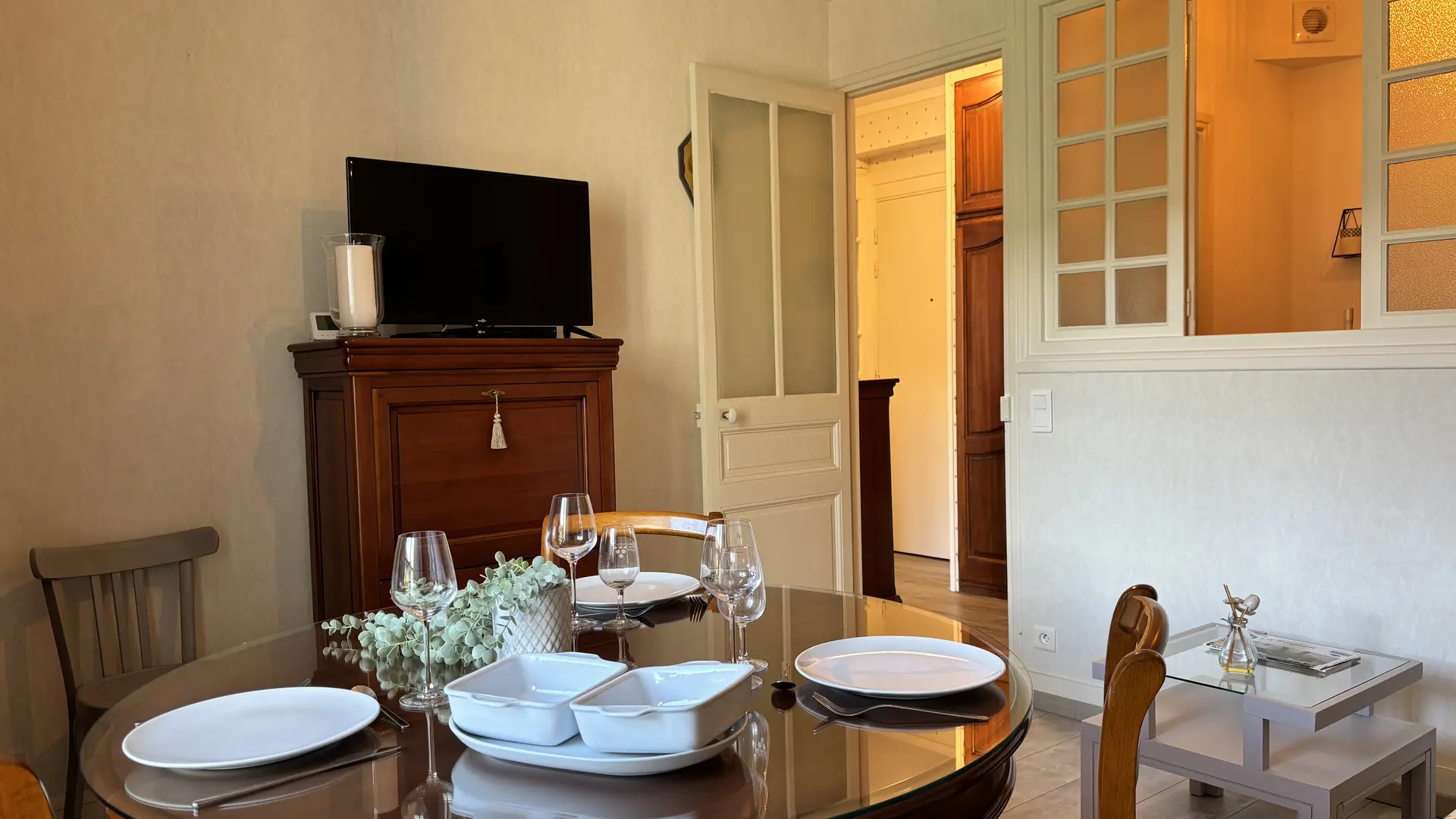 Agréable salon séjour avec son espace repas et son téléviseur.