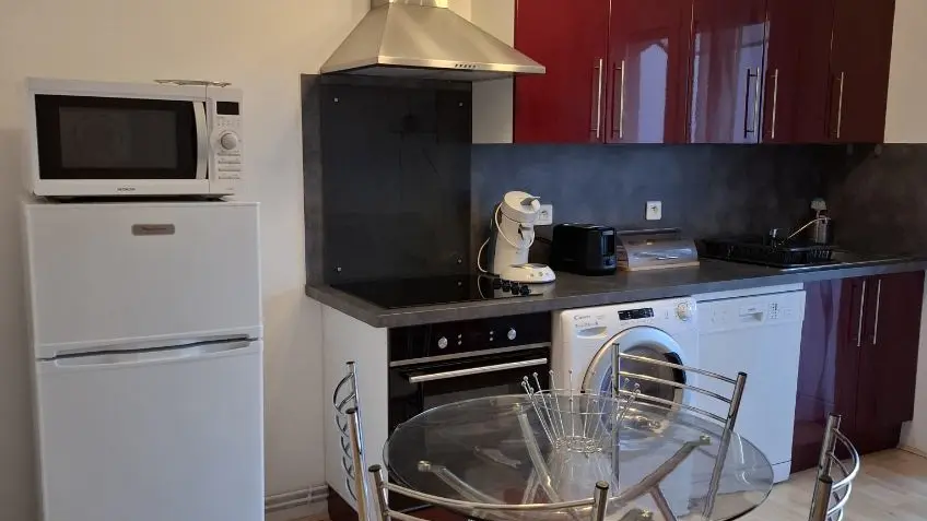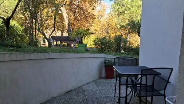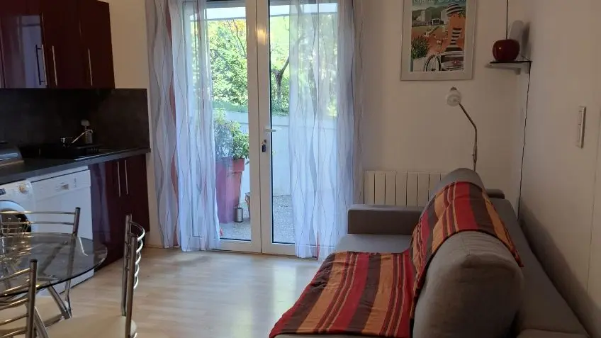 Bel appartement plain pied, séjour, coin cuisine de 14m² tout équipé. La chambre est d'une superficie de 13 m² est équipée de placard. Le jardin et la terrasse vous laisseront la possibilité de barbecue l'été. Le stationnement se fait dans la propriété.