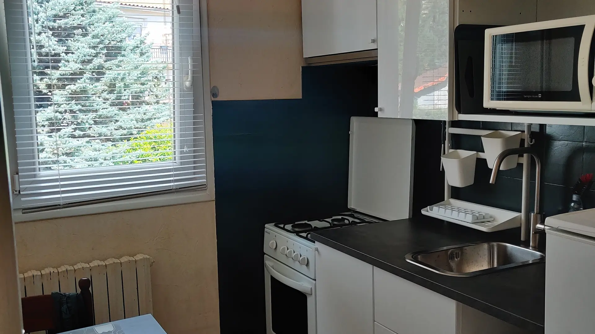 - une cuisine séparée équipée avec réfrigérateur, plaques, four, … et un coin repas