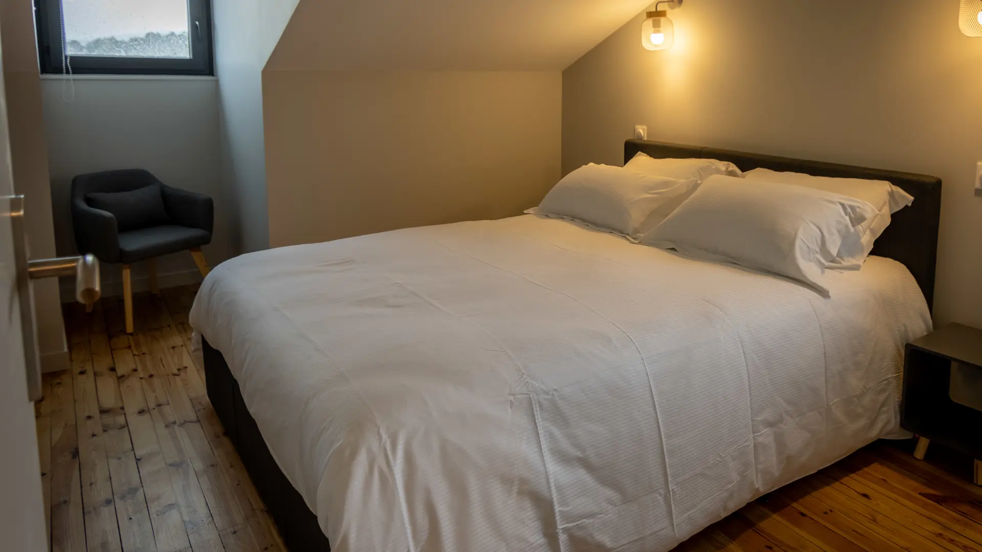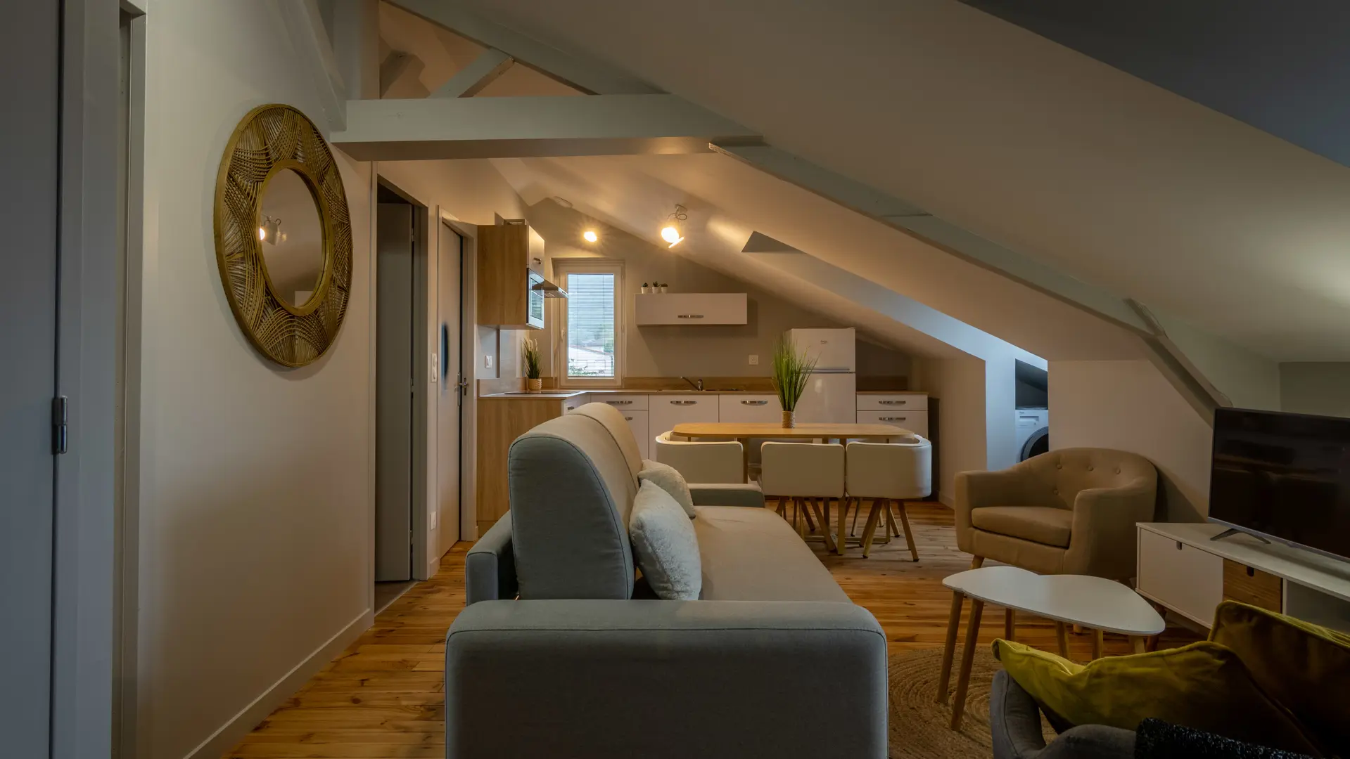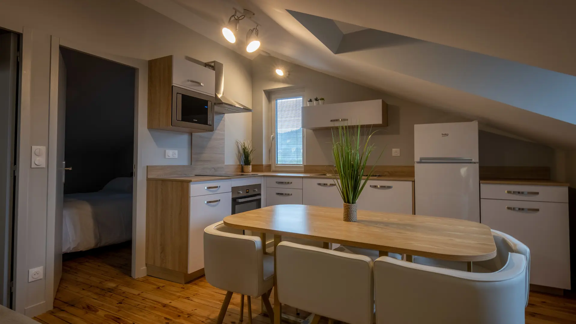 Situé au troisième étage, ce douillet appartement mansardé, meublé avec sobriété et goût de 45 m2 pour une à six personnes propose un grand séjour lumineux avec fenêtres. Le canapé convertible, vous donnera la possibilité d’un couchage confortable en 140. Vous pourrez vous reposer dans une des deux chambres confortables aux lits en 160. Vous y trouverez toute la place nécessaire pour ranger vos affaires. Équipée d’une grande douche à l’italienne, la salle de bain est également très agréable et le logement est équipé d’un lave-linge séchant. Les WC sont séparés. La cuisine moderne et fonctionnelle est dotée de tous les équipements : plaque à induction -vaisselle -réfrigérateur-congélateur, four, micro-ondes et lave-vaisselle.