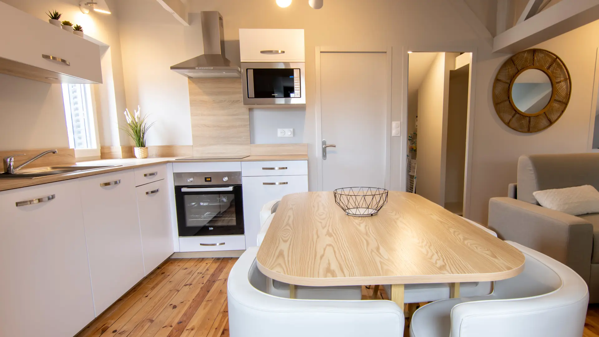 Situé au troisième étage, ce douillet appartement mansardé, meublé avec sobriété et goût de 45 m2 pour une à six personnes propose un grand séjour lumineux avec fenêtres. Le canapé convertible, vous donnera la possibilité d’un couchage confortable en 140. Vous pourrez vous reposer dans une des deux chambres confortables aux lits en 160. Vous y trouverez toute la place nécessaire pour ranger vos affaires. Équipée d’une grande douche à l’italienne, la salle de bain est également très agréable et le logement est équipé d’un lave-linge séchant. Les WC sont séparés. La cuisine moderne et fonctionnelle est dotée de tous les équipements : plaque à induction -vaisselle -réfrigérateur-congélateur, four, micro-ondes et lave-vaisselle.