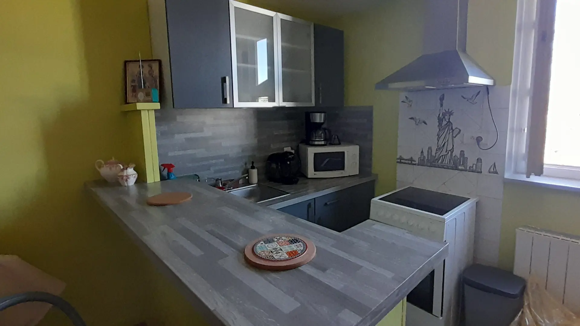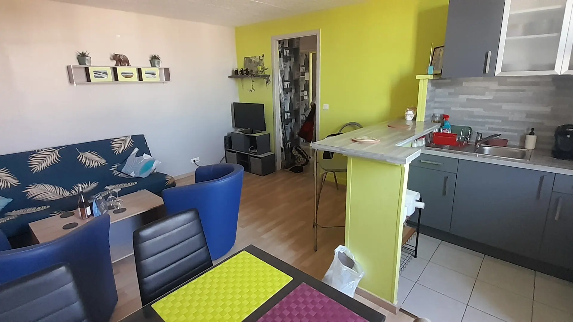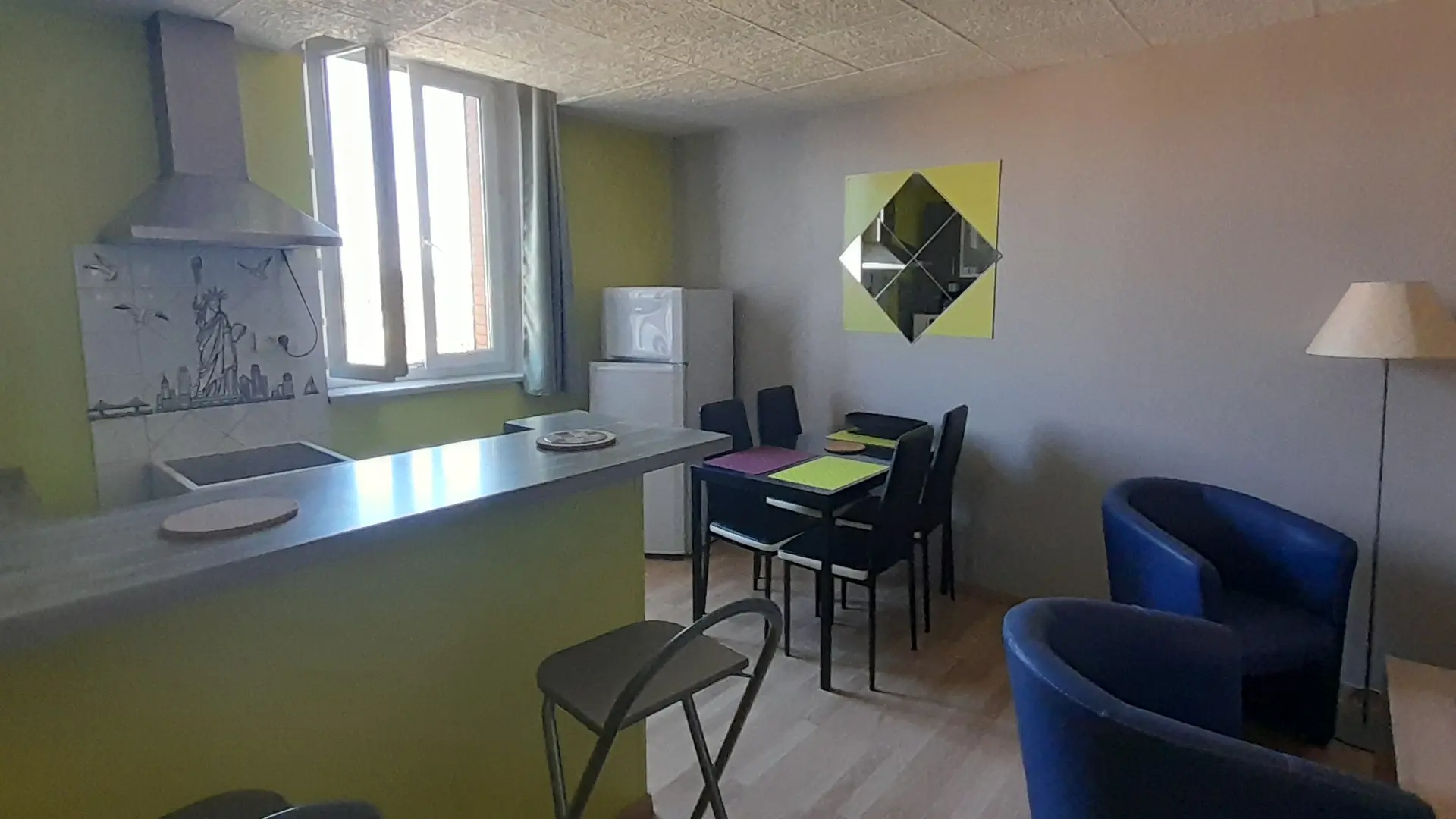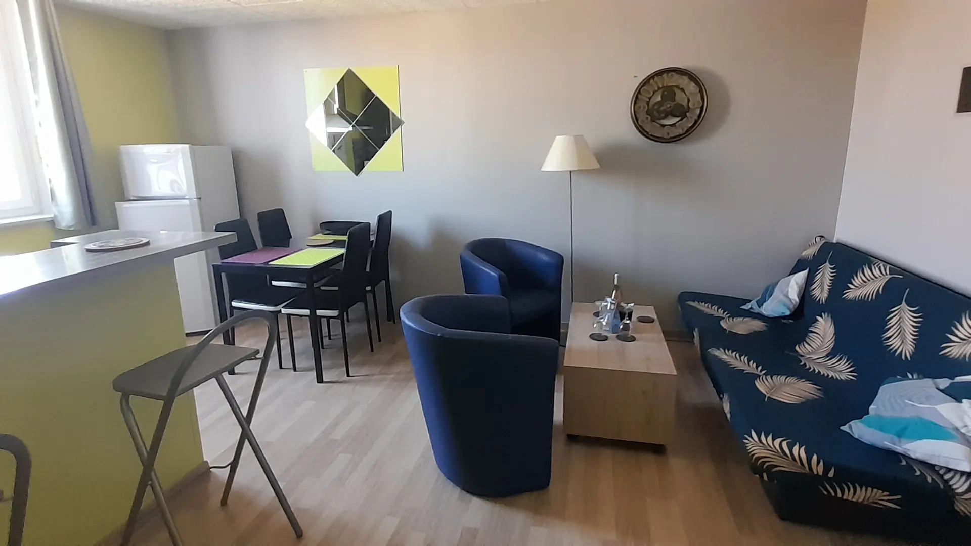 La Location : Cuisine équipée, vaisselle, micro-ondes, réfrigérateur, cuisinière et four électriques, table, 4 chaises, 2 tabourets, canapé, 2 fauteuils, table basse, lit 2 personnes (140/190), grande armoire, salle de bain avec douche, lavabo, toilette, lave-linge sèche-linge, TV, WIFI, accès sécurisé de la résidence (interphone)