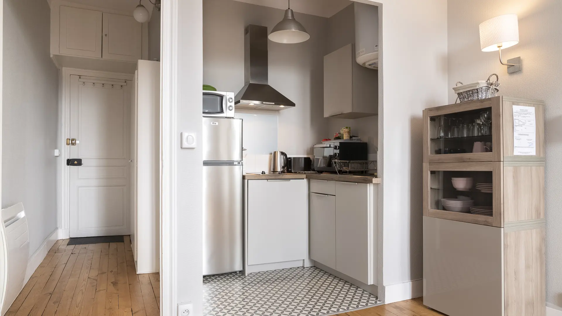Cet appartement de 37 m2, niché au 4ème étage avec ascenseur d’une résidence de caractère, offre un charme unique. Baigné de lumière grâce à son exposition, l’espace intérieur est composé d’un coin cuisine entièrement équipé donnant sur un salon avec 2 fauteuils et TV écran plat, d’une grande chambre avec lit de 180 cm et d’une salle d’eau avec douche à l’italienne, WC et sèche-serviettes.