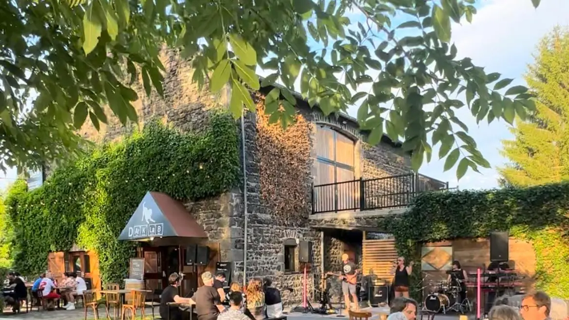 Une grande salle avec cheminée et voûtes en pierres de lave ainsi qu’une belle terrasse arborée au cœur du Parc Naturel Régional des Volcans d'Auvergne font le charme et la convivialité de Dark Lab, été comme hiver !