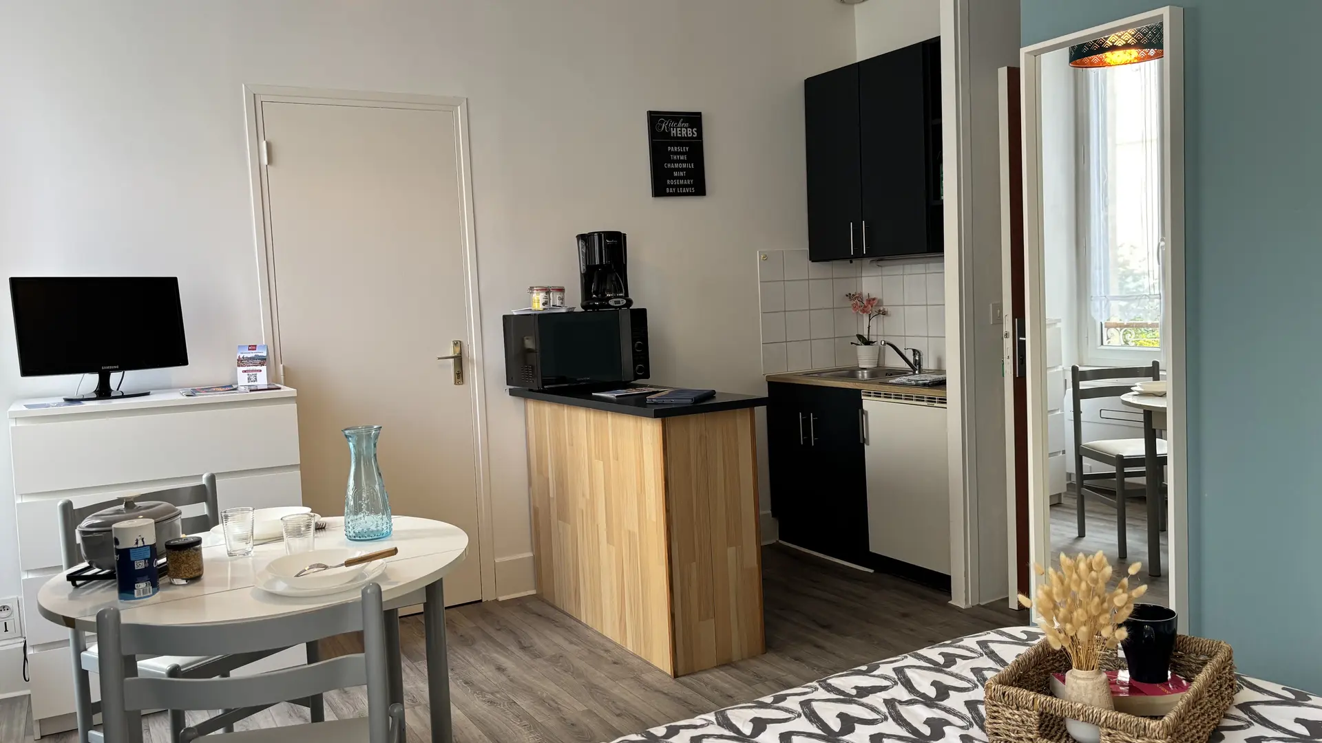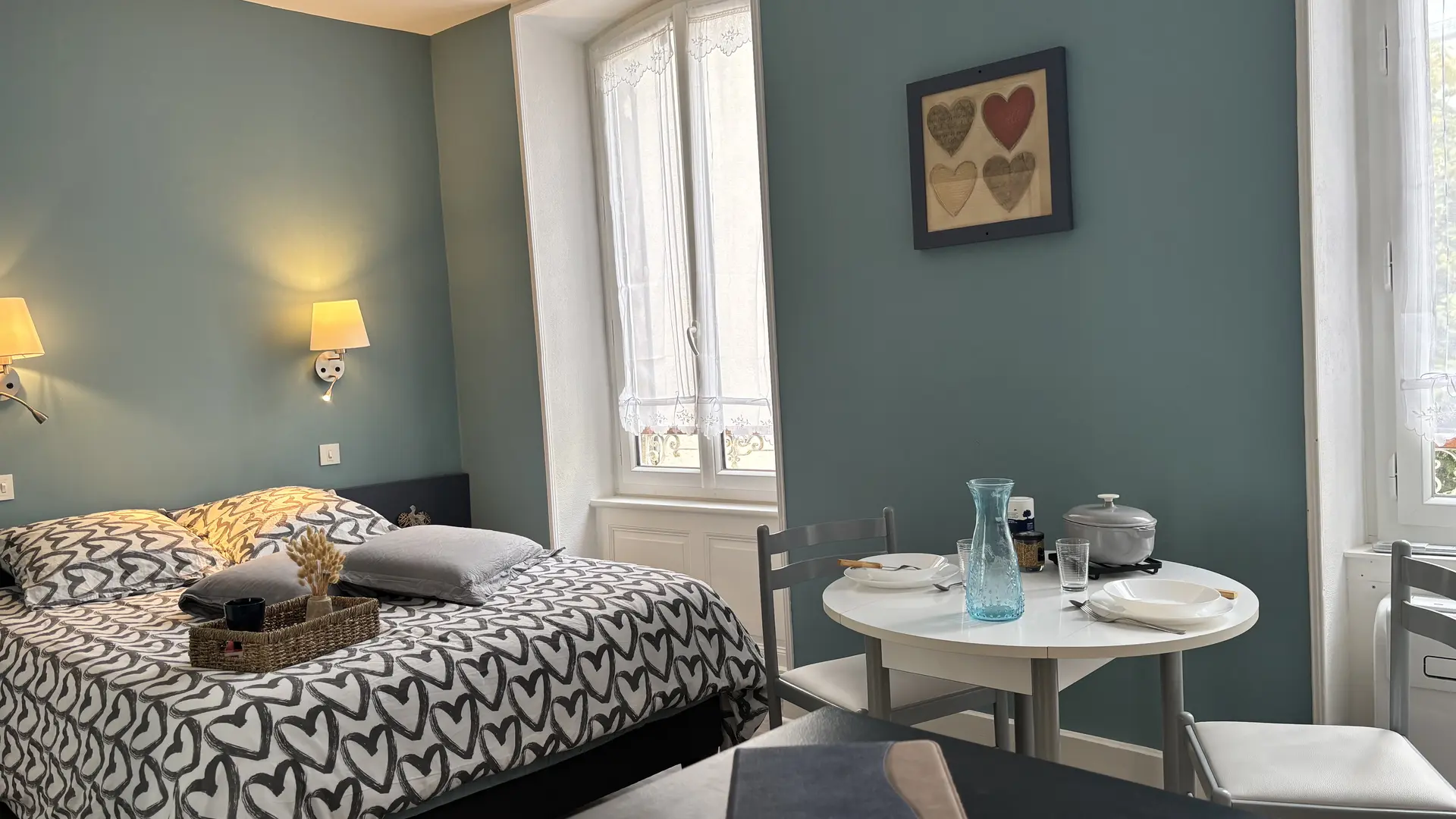 - un espace repas avec cuisine équipée (cafetière à filtre, bouilloire, grille-pain, appareil à raclette, micro-onde...)