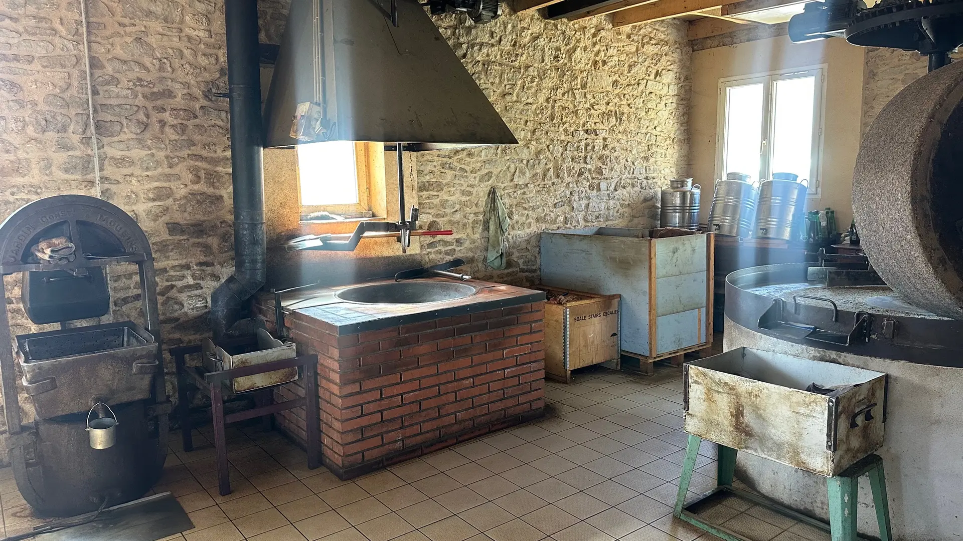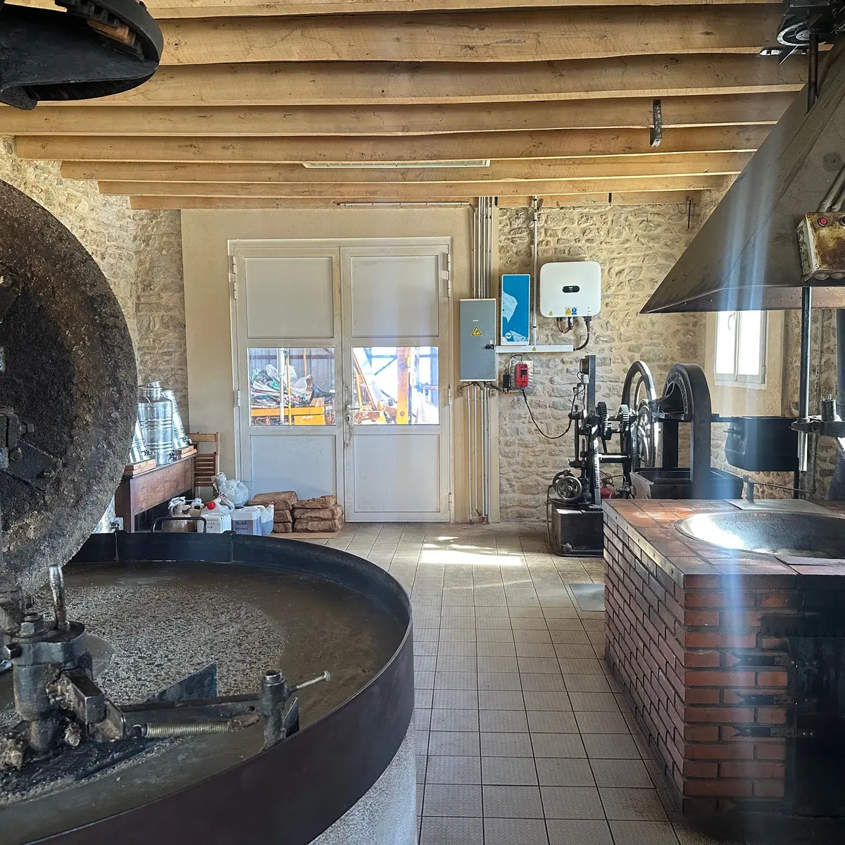 Pour la fabrication, vous apprendrez d'abord à écraser les fruits à coque à l'aide d'une meule. Cela donne une pâte qu'il faut ensuite chauffer pile poil à la bonne température, pour en extraire l'huile dans le pressoir. Cette huile est ensuite pressée avant d'être mise en fût à décanter pendant 1 à 2 semaines.