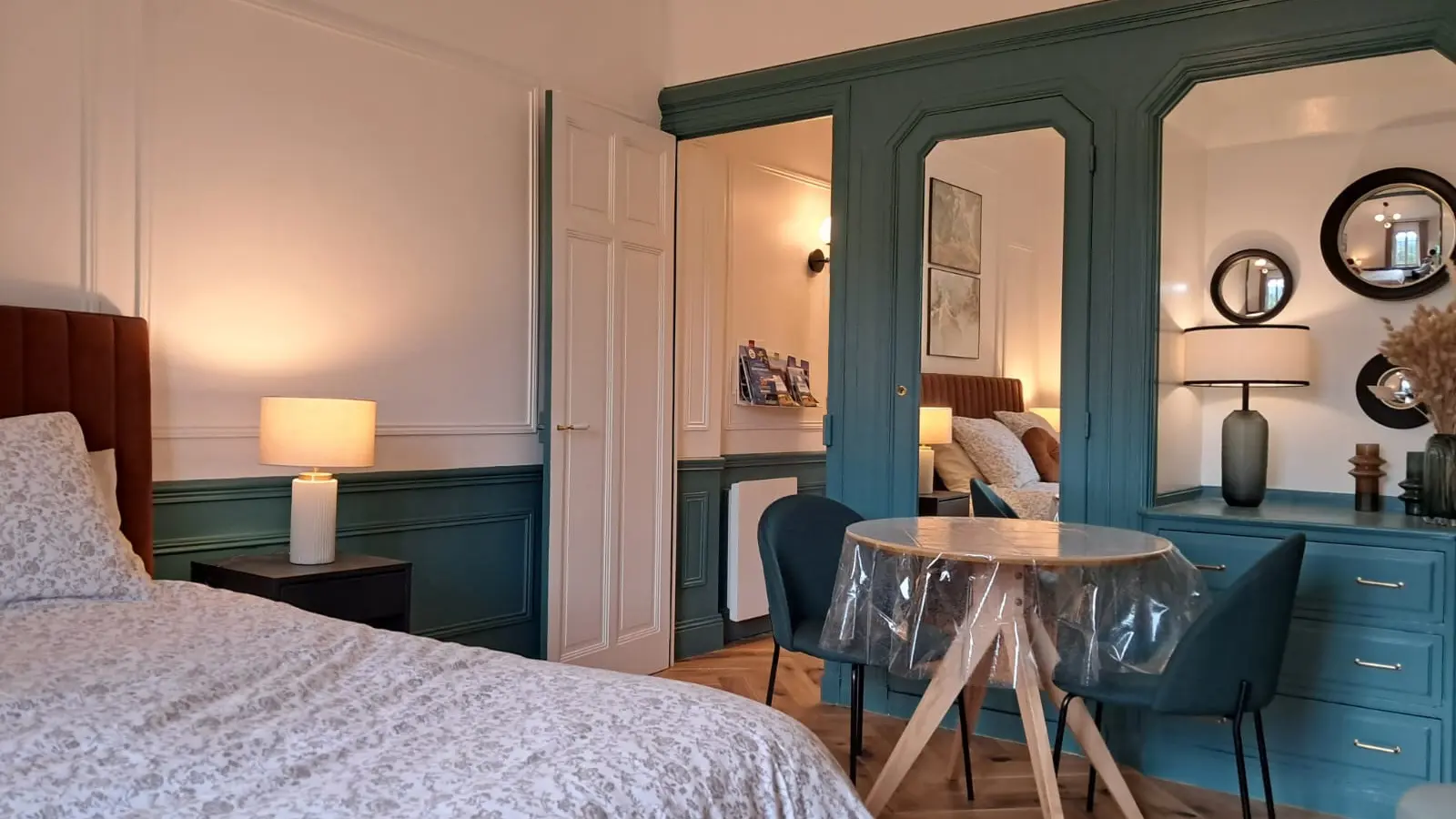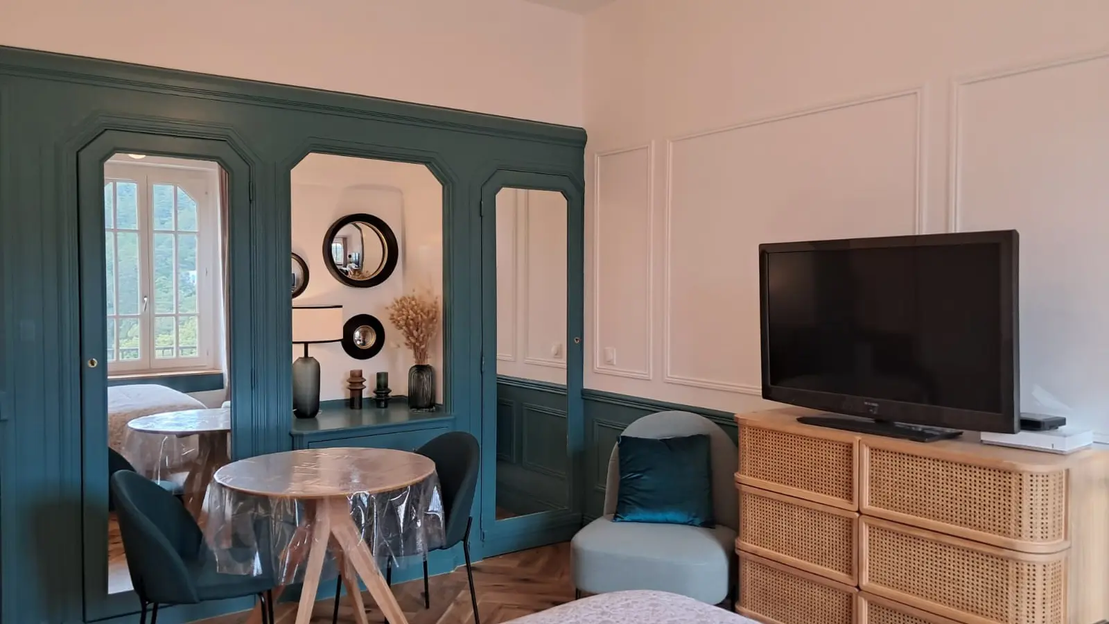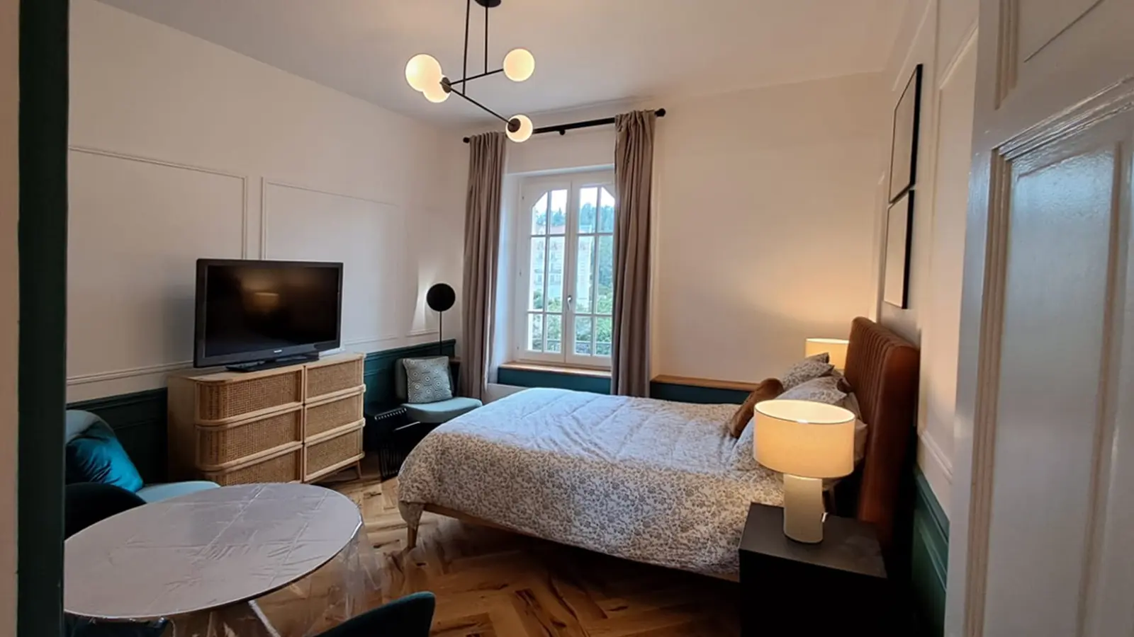 En effet votre appartement est doté d’une cuisine équipée comme une grande où vous trouverez tout le nécessaire pour cuisiner si le cœur vous en dit, d’un salon-salle à manger pourvu d’un espace séjour pour regarder la télé, bouquiner ou juste vous reposer face au Parc, d’un grand lit pour profiter pleinement de nuits reposantes, et d’une salle d’eau tout aussi agréable avec sa grande douche.