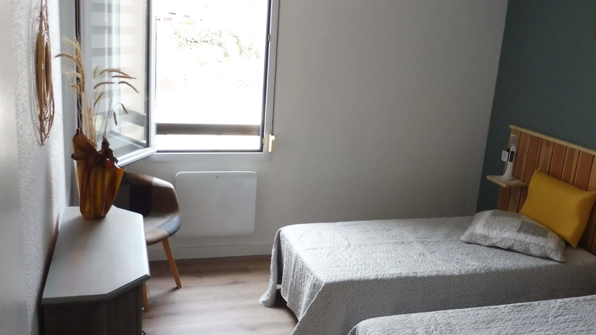 1 chambre avec 2 lits jumeaux et un salon avec un canapé convertible BZ 140*190. Lit parapluie et table bébé.