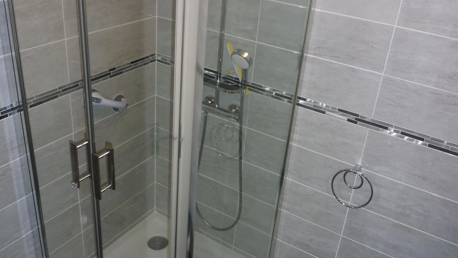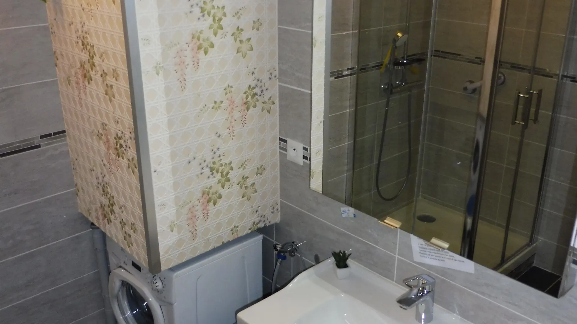 Salle de bain avec une grande douche 90*90, une machine à laver.
