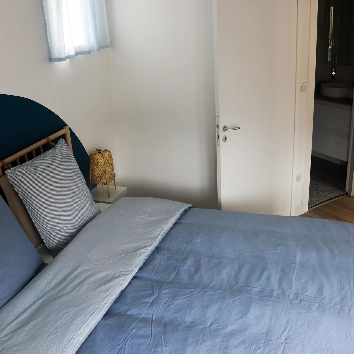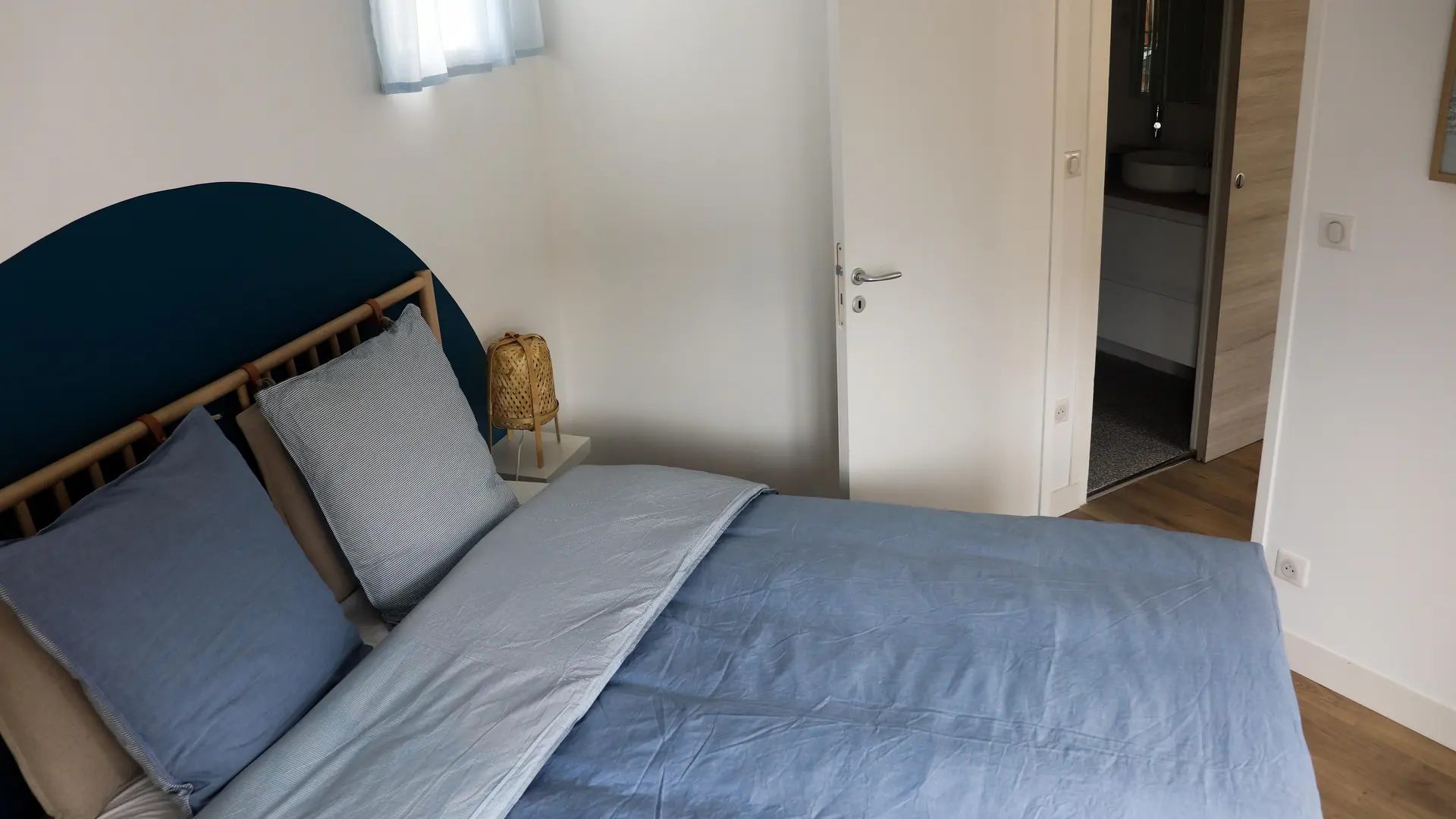 -d'une chambre avec lit 160X200, placard intégré avec rangement, deux tables de chevet.