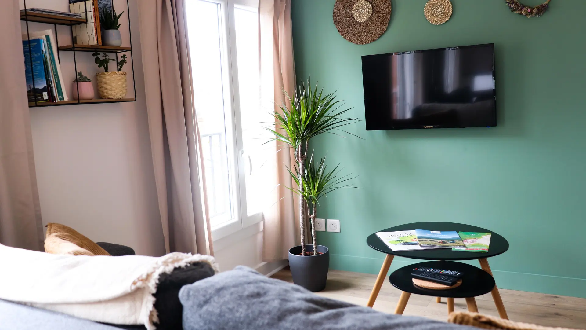 -d'un salon avec canapé (convertible) télévision et connexion internet.